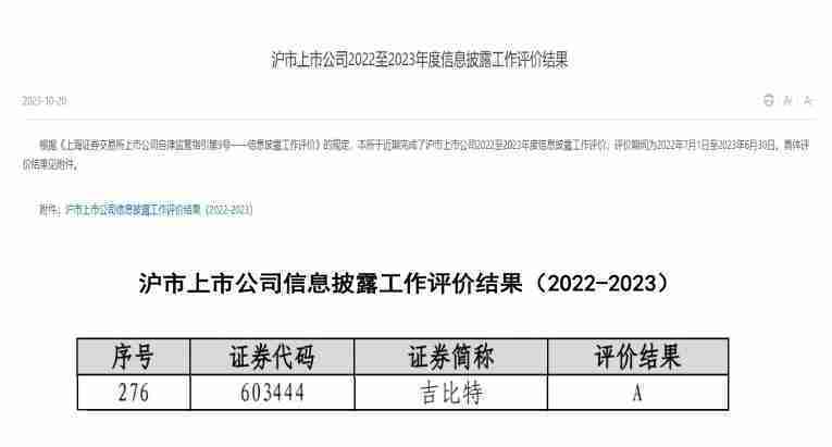 近日,,,上海证券交易所发布2022-2023年度信息披露工作评价结果。。。J9.COM(股票代码:::603444)凭借规范的公司治理、、、高质量的信息披露以及良好的投资者关系管理再次荣获信息披露工作A级评价,,,,公司连续两年获此殊荣。。。
